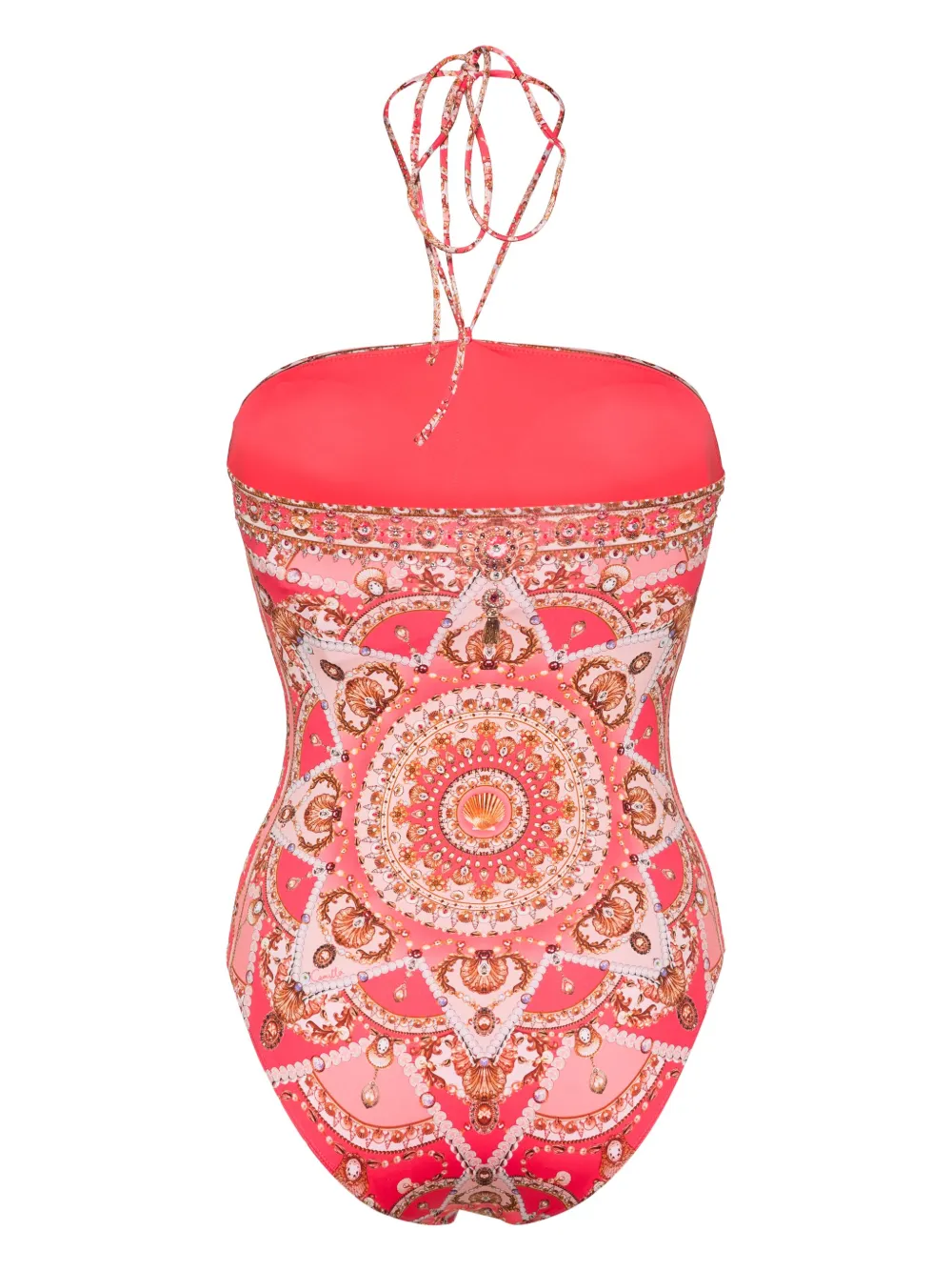 koraalroze gerecyclede polyamideblend stretch design all-over grafische print bandeau halternek striksluiting hoog uitgesneden volledige voering Zwemkleding moet over je eigen kleding worden aangepast.