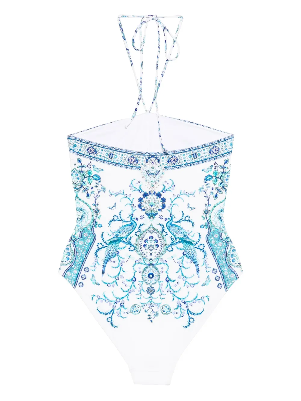 wit paisley-print halternek vogelpatroon blauwe details Zwemkleding moet over je eigen kleding worden aangepast.