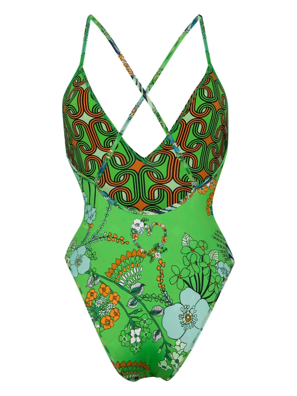 groen gerecyclede polyamideblend bloemenprint gekruiste bandjes aan de achterkant V-hals Onderkant in hipster-stijl Zwemkleding moet over je eigen kleding worden aangepast.
