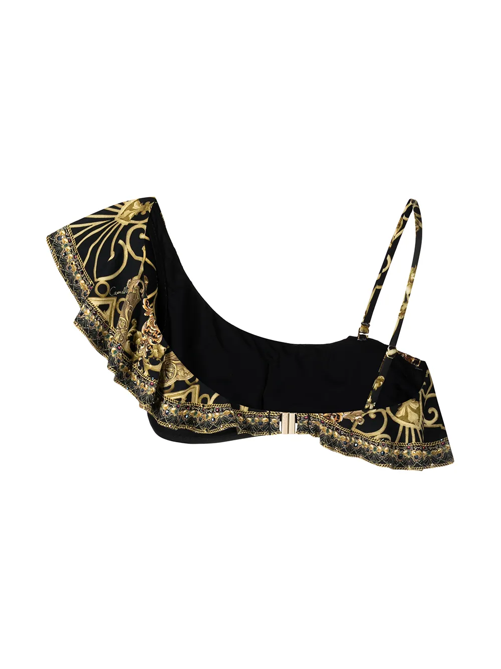Barokprint, asymmetrisch en ruche details. Zwemkleding moet over je eigen kleding worden aangepast..