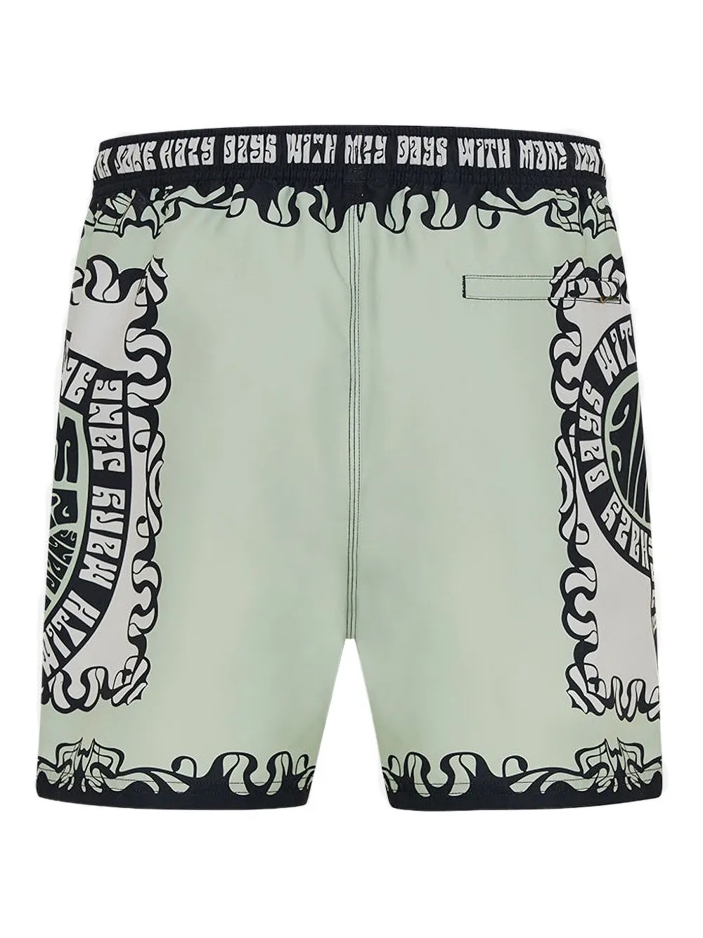 lichtgroen bedrukt design trekkoordsluiting elastische tailleband achterzak afwerking Zwemkleding moet over je eigen kleding worden aangepast.