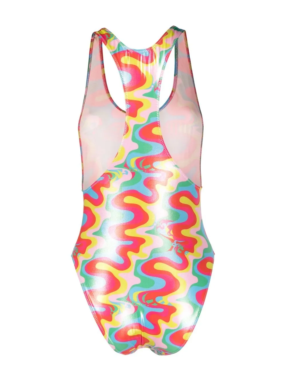 Veelkleurig, abstract patroon, logoprint op de voorkant, ronde hals, gekruiste rug en stretch design. Zwemkleding moet over je eigen kleding worden aangepast..
