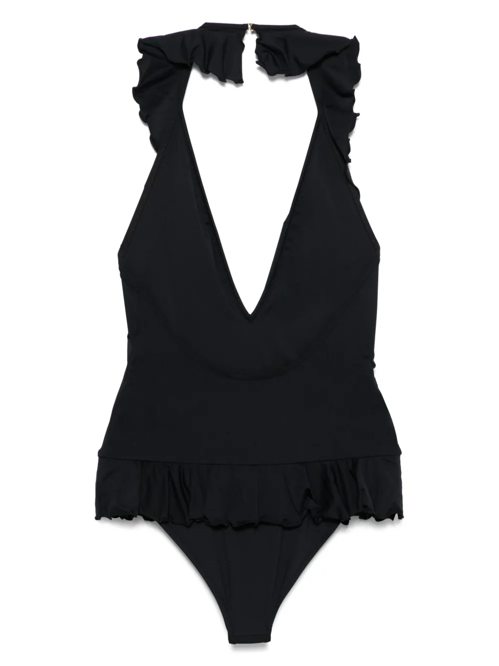 zwart haaksluiting aan de achterkant halternek lage rug Zwemkleding moet over je eigen kleding worden aangepast.