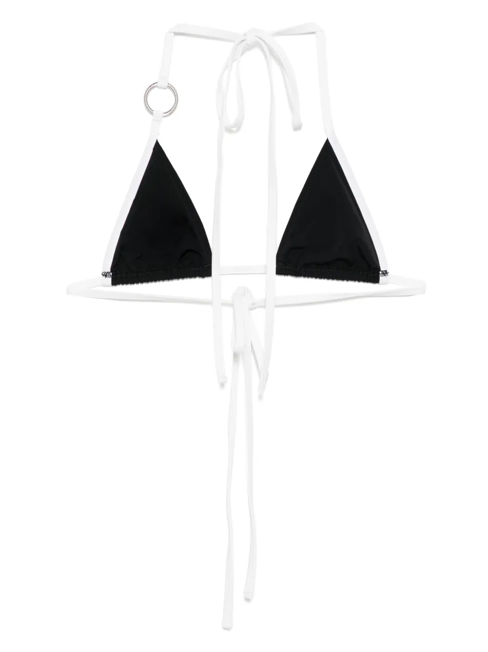 zwart striksluiting aan de achterkant halternek striksluiting driehoekige vorm Zwemkleding moet over je eigen kleding worden aangepast.