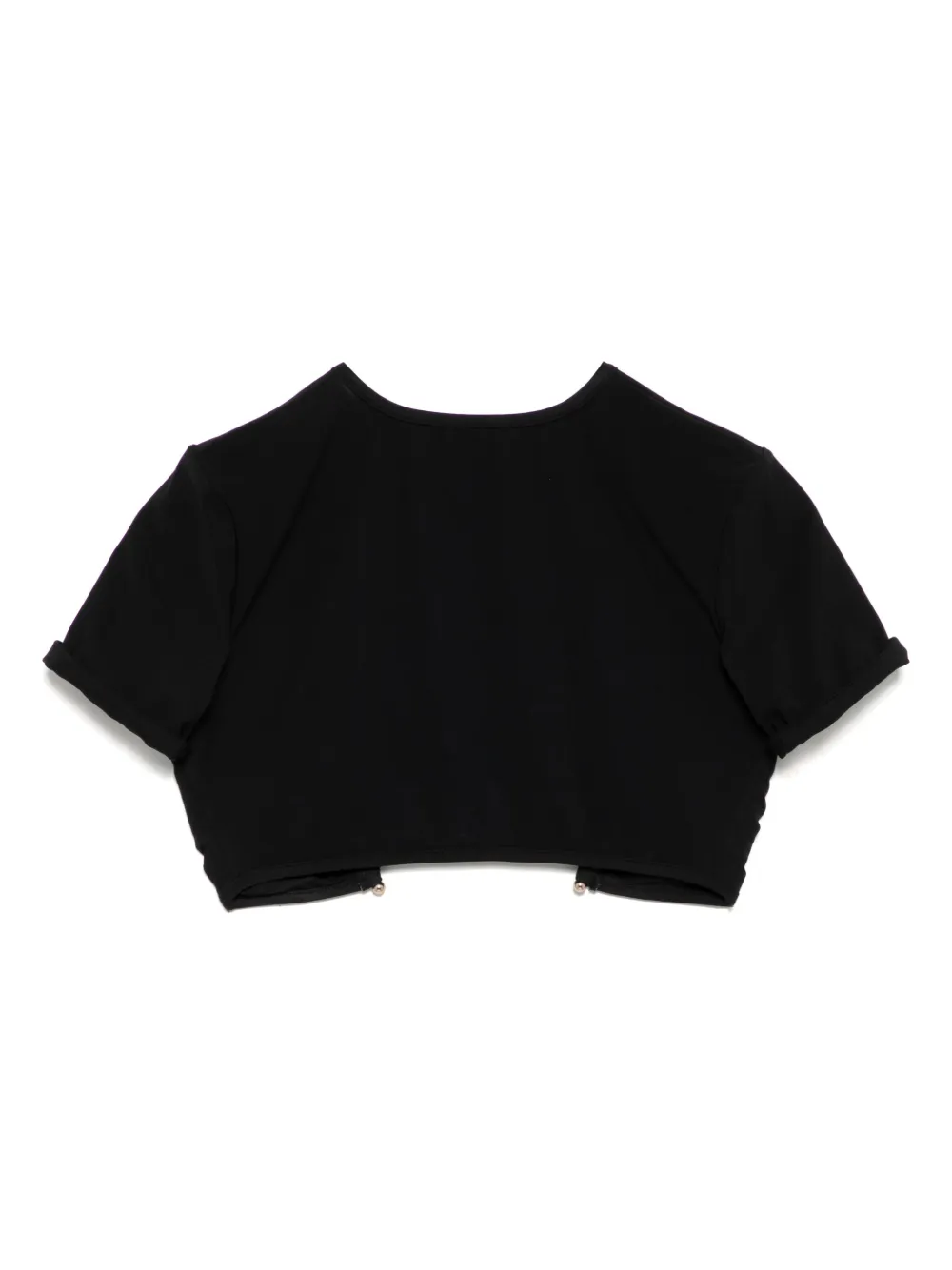 zwart stretch design ronde hals korte mouwen zilverkleurig materiaal op maat gemaakte U-draad hardware gemaakt van messing ruchedetails instapmodel Zwemkleding moet over je eigen kleding worden aangepast.