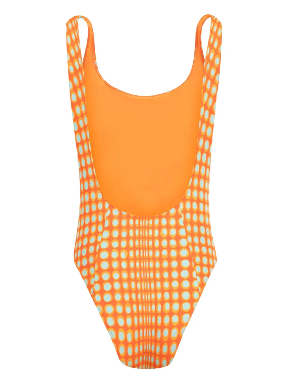 oranje stippenprint diepe ronde hals lage rug schouderbanden Zwemkleding moet over je eigen kleding worden aangepast.