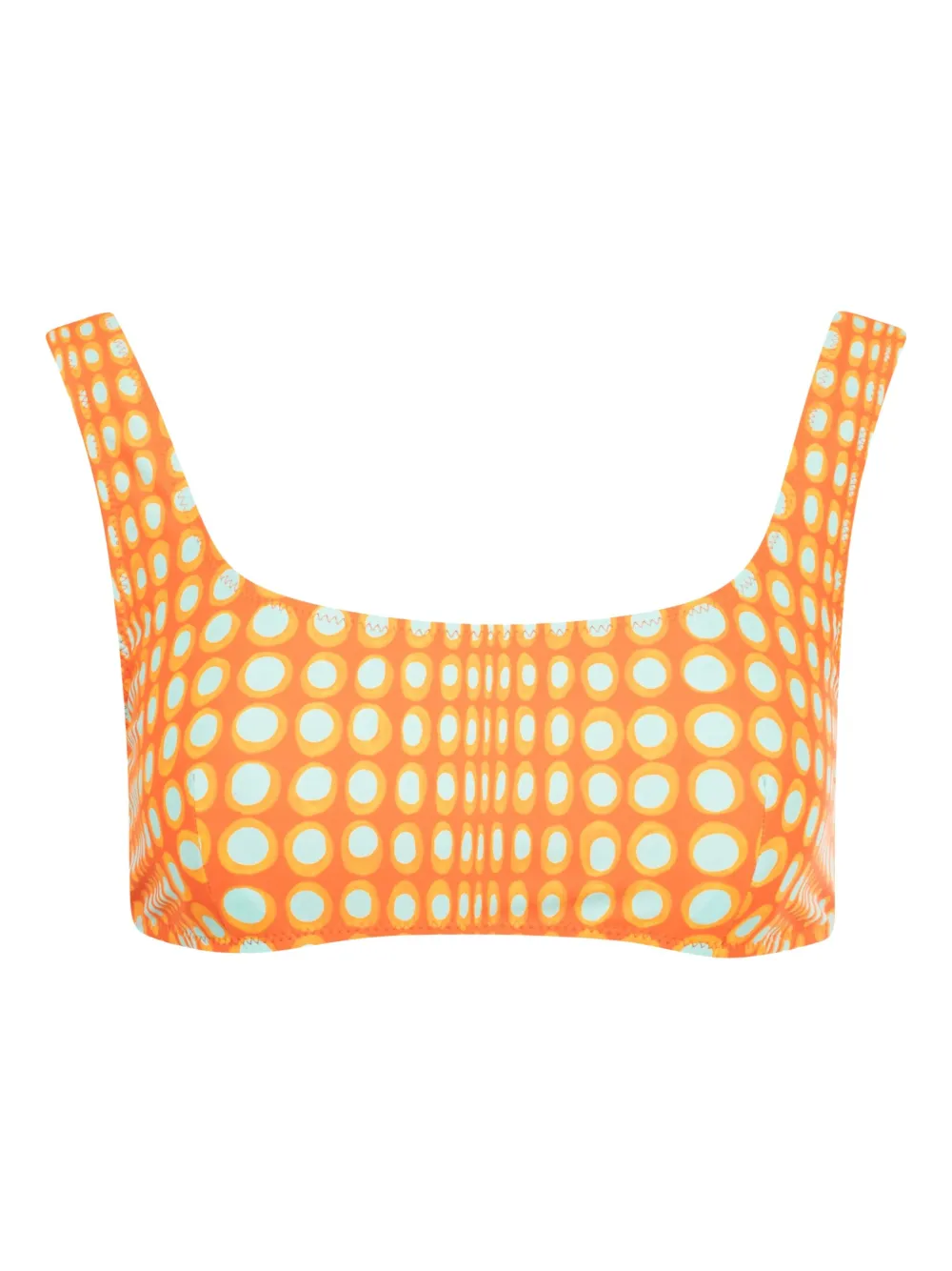 oranje stippenprint brede schouderbandjes diepe ronde hals gespsluiting aan de achterkant Zwemkleding moet over je eigen kleding worden aangepast.