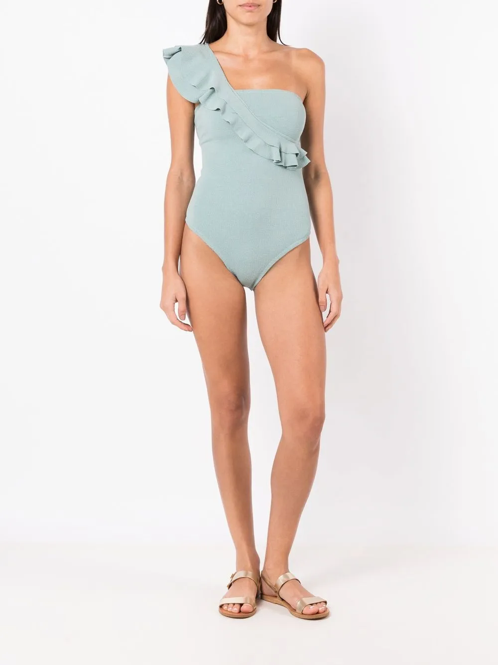 Turkoois, asymmetrisch, hoog uitgesneden, uitgesneden detail , ruche hals en medium dekking. Zwemkleding moet over je eigen kleding worden aangepast..