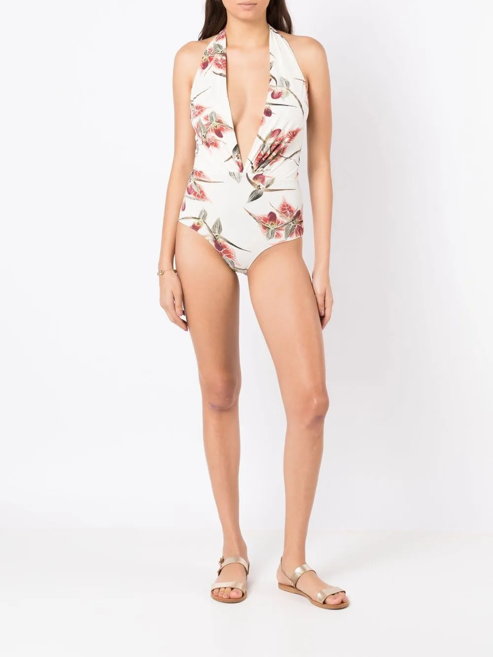 Wit/veelkleurig, stretch design, bloemenprint, ruchedetails, halternek striksluiting en diepe V-hals. Zwemkleding moet over je eigen kleding worden aangepast..