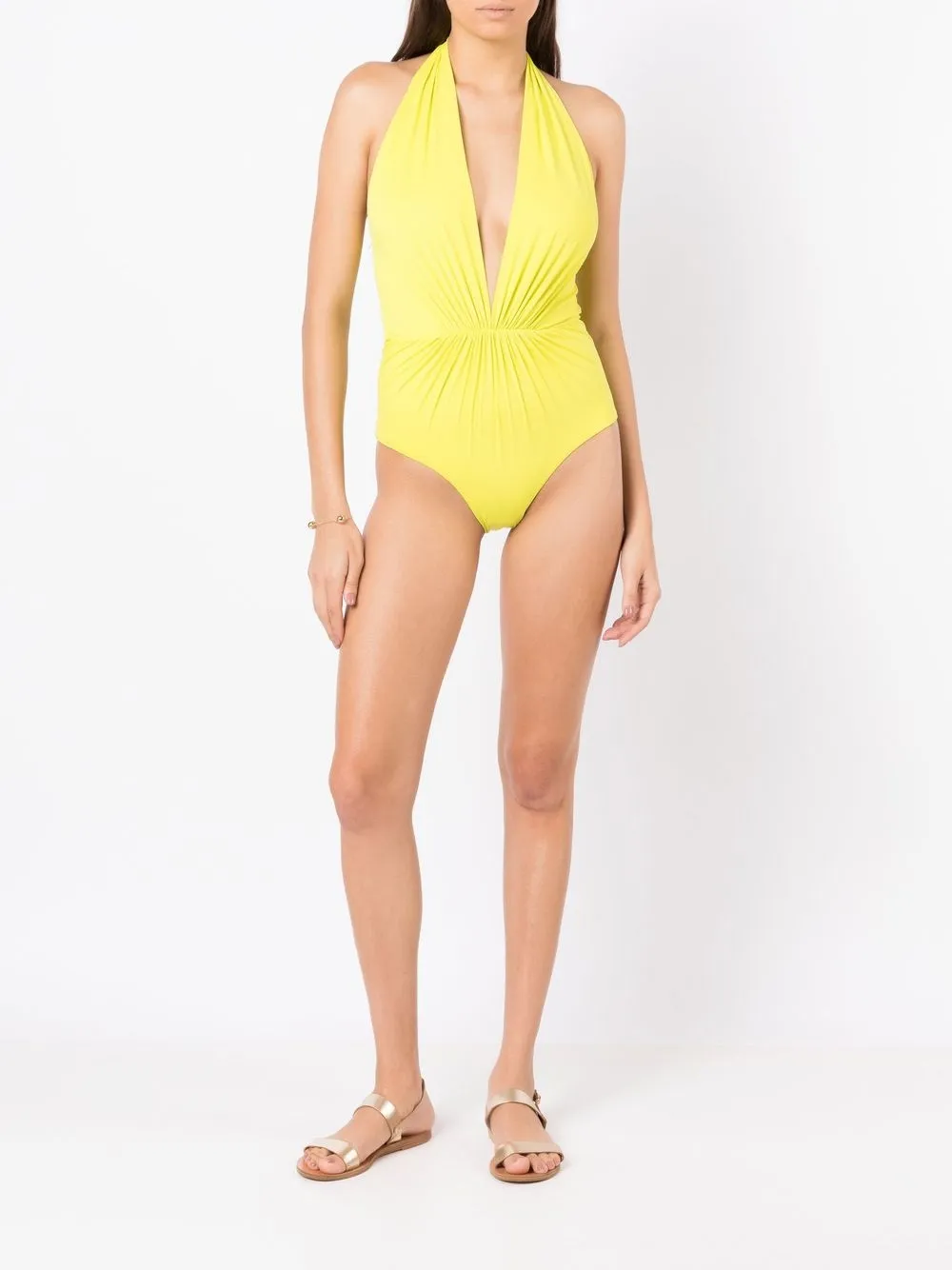 Limoengroen, diepe V-hals en halternek. Zwemkleding moet over je eigen kleding worden aangepast..