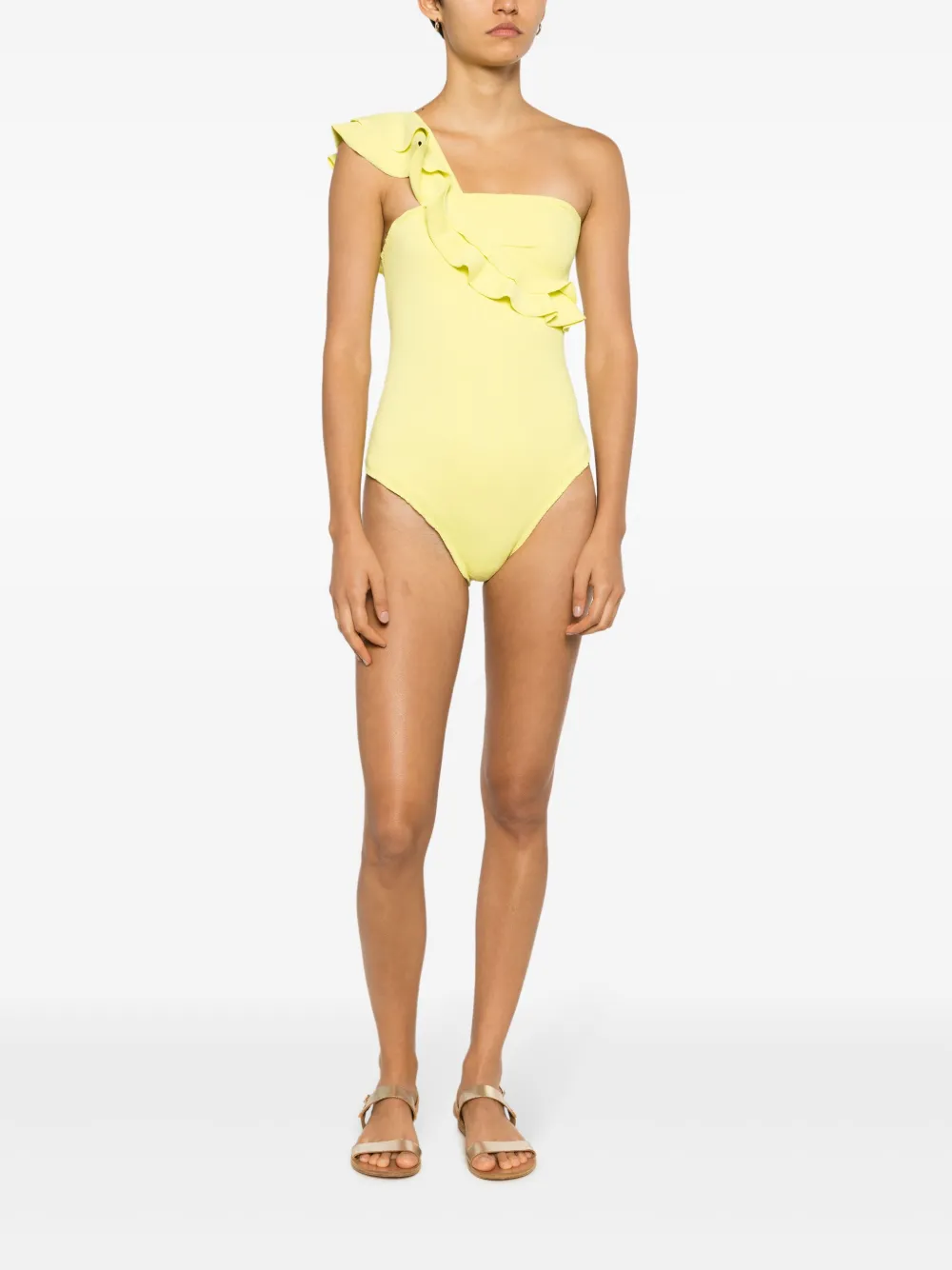 Citroengeel, stretch design, ruche details, uitgesneden detail, asymmetrisch en mouwloos. Zwemkleding moet over je eigen kleding worden aangepast..