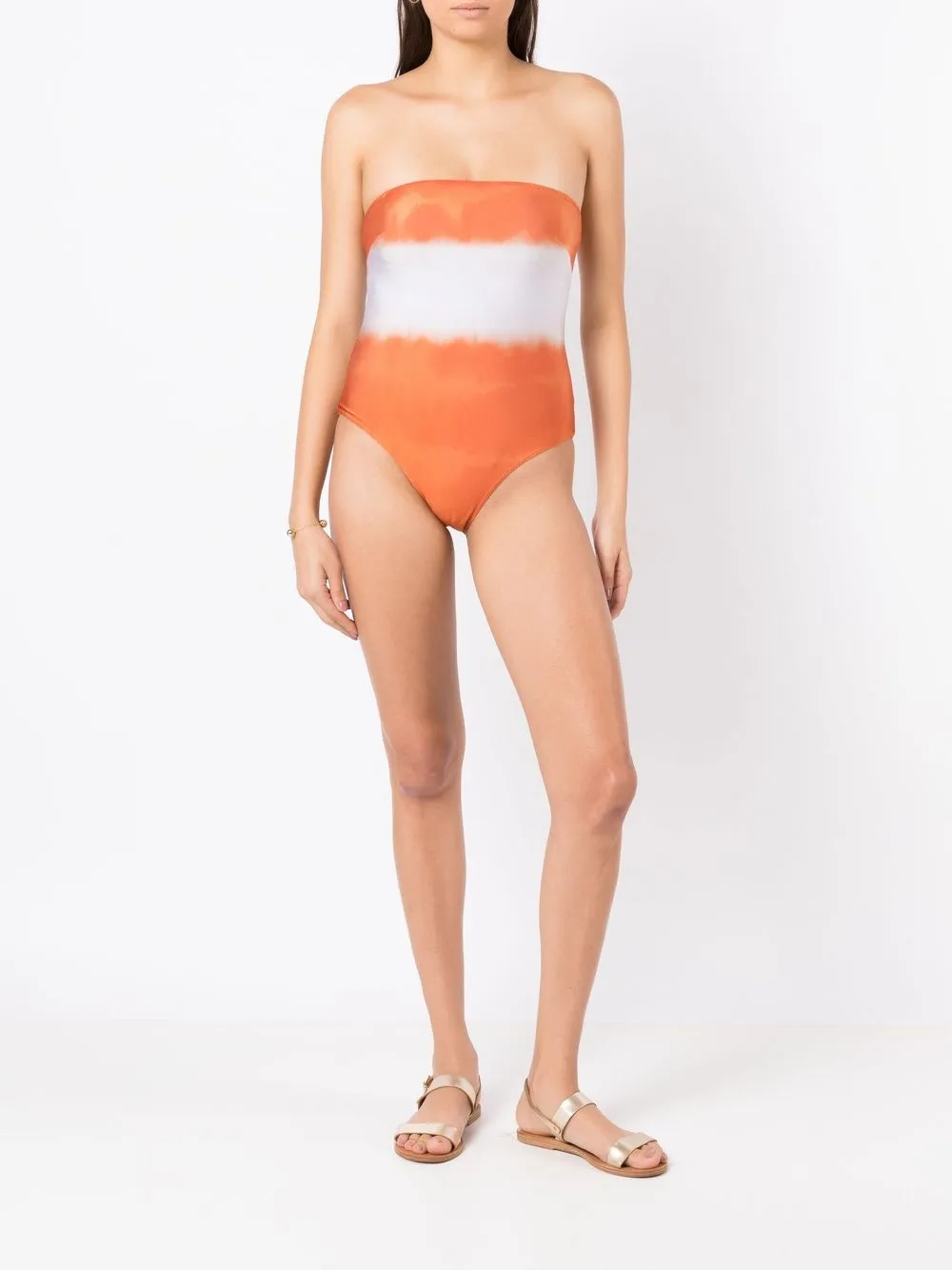 Worteloranje, stretch design, tie-dye print, strapless , afneembare schouderbandjes en hoog uitgesneden. Zwemkleding moet over je eigen kleding worden aangepast..