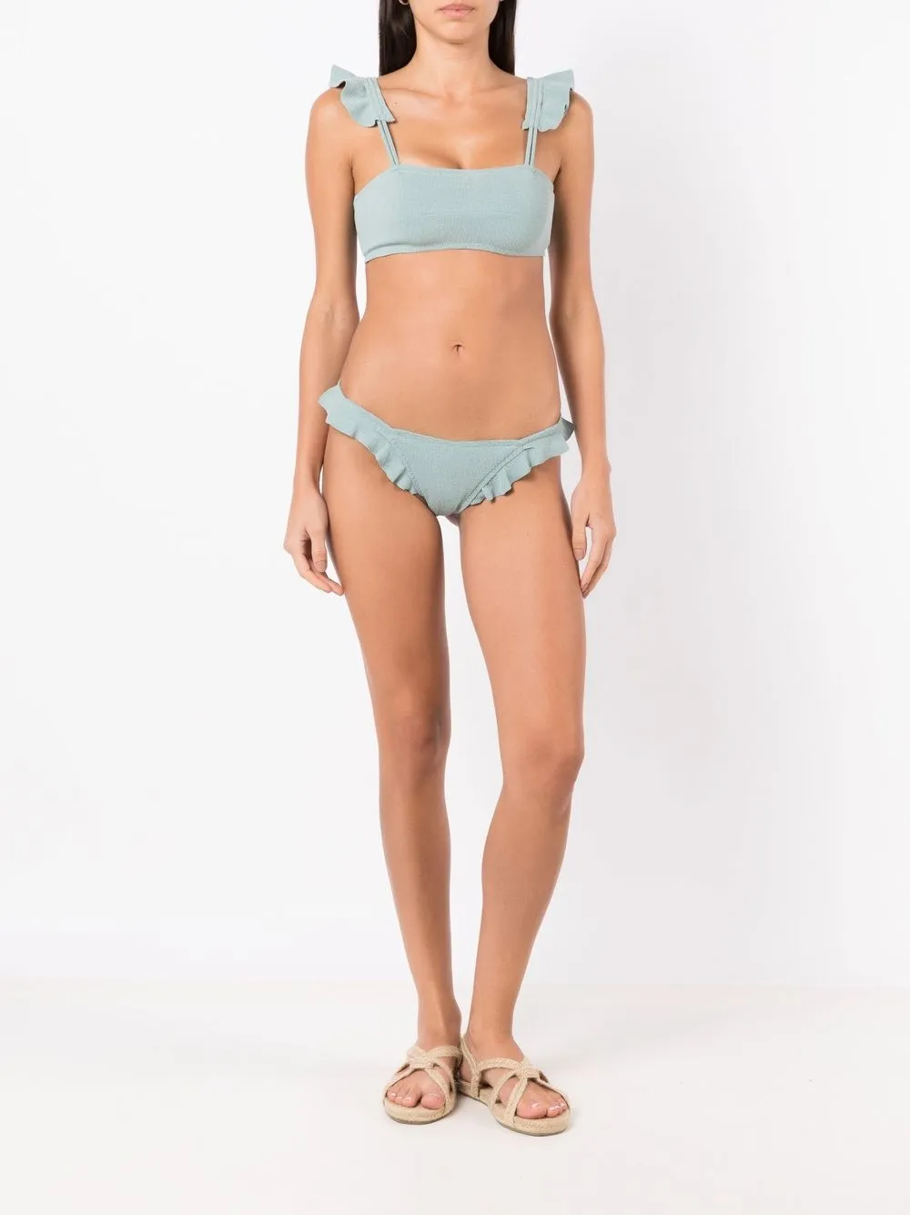 Turkoois, stretch design, ruche hals, gewelfde afwerking en lichte tot medium dekking. Zwemkleding moet over je eigen kleding worden aangepast..