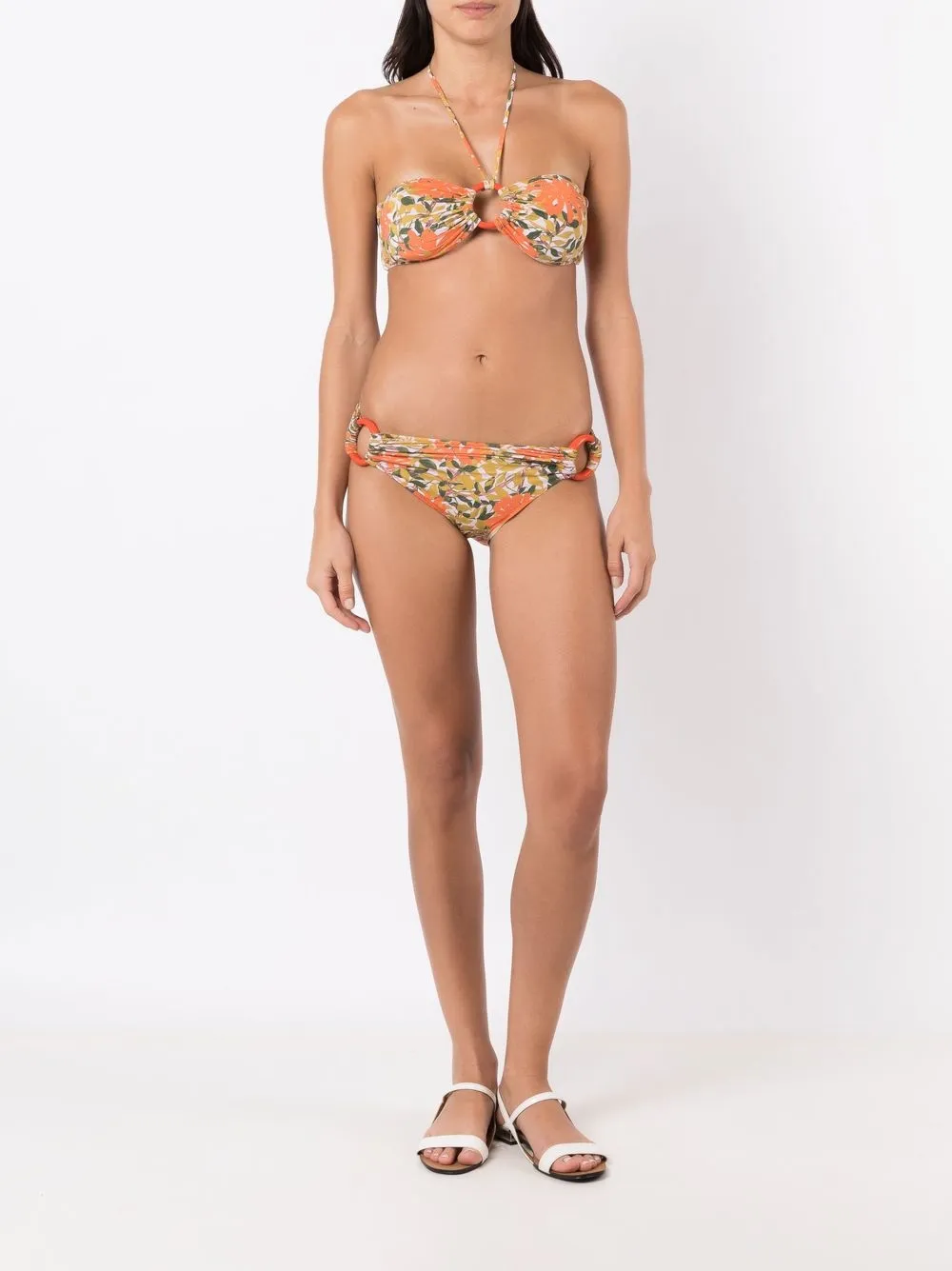 Stretch design, all-over bloemenprint, ruchedetails, halternek striksluiting, sluiting aan de achterkant en bandeau. Zwemkleding moet over je eigen kleding worden aangepast..