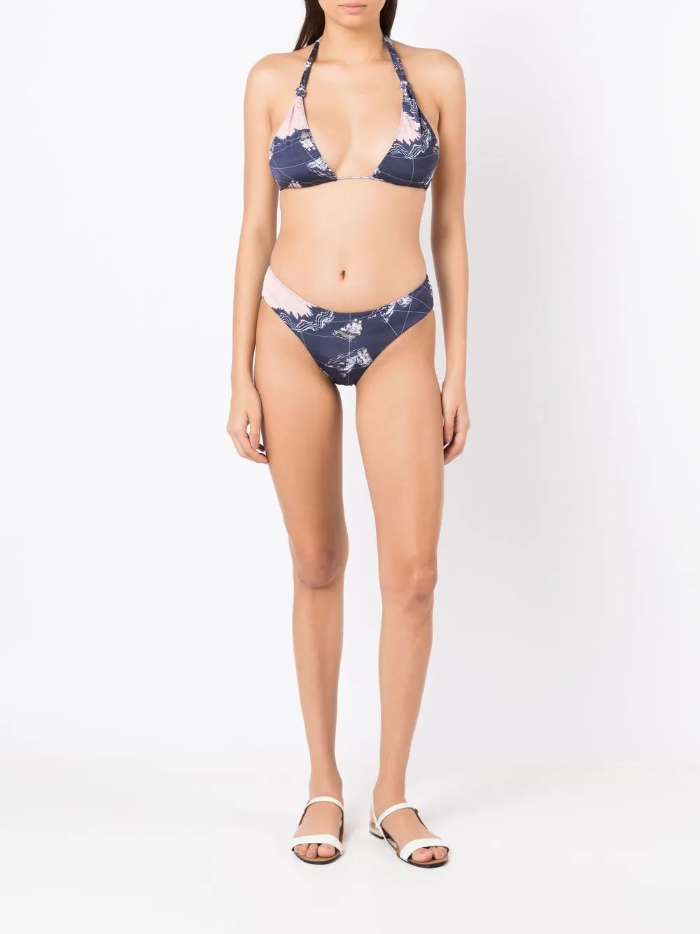 Marineblauw, geborduurd design, diepe V-hals, halternek en gespsluiting aan de achterkant. Zwemkleding moet over je eigen kleding worden aangepast..
