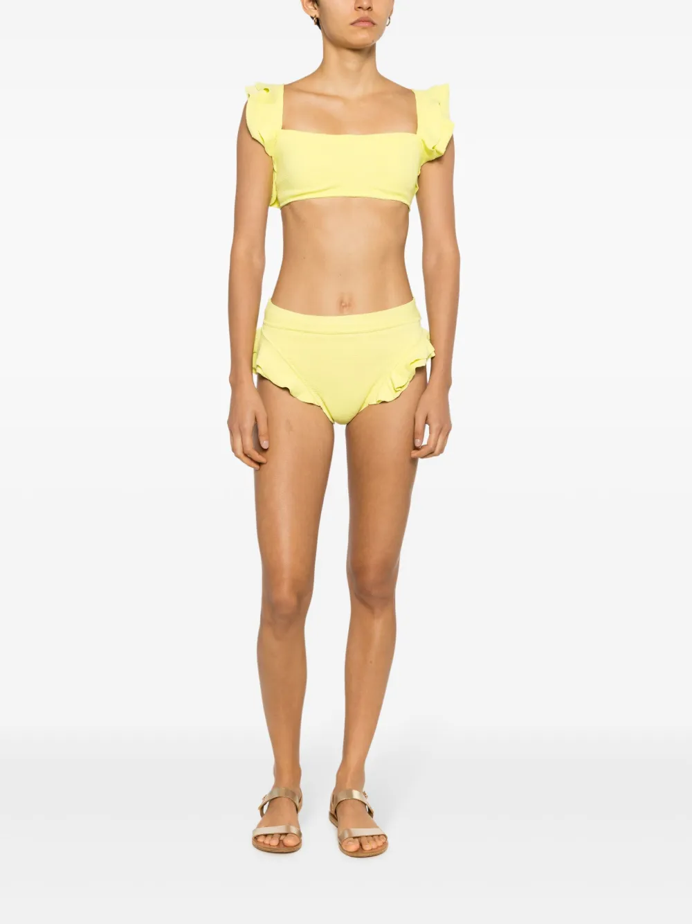Citroengeel, stretch design, ruche details, vierkante hals en rechte zoom. Zwemkleding moet over je eigen kleding worden aangepast..