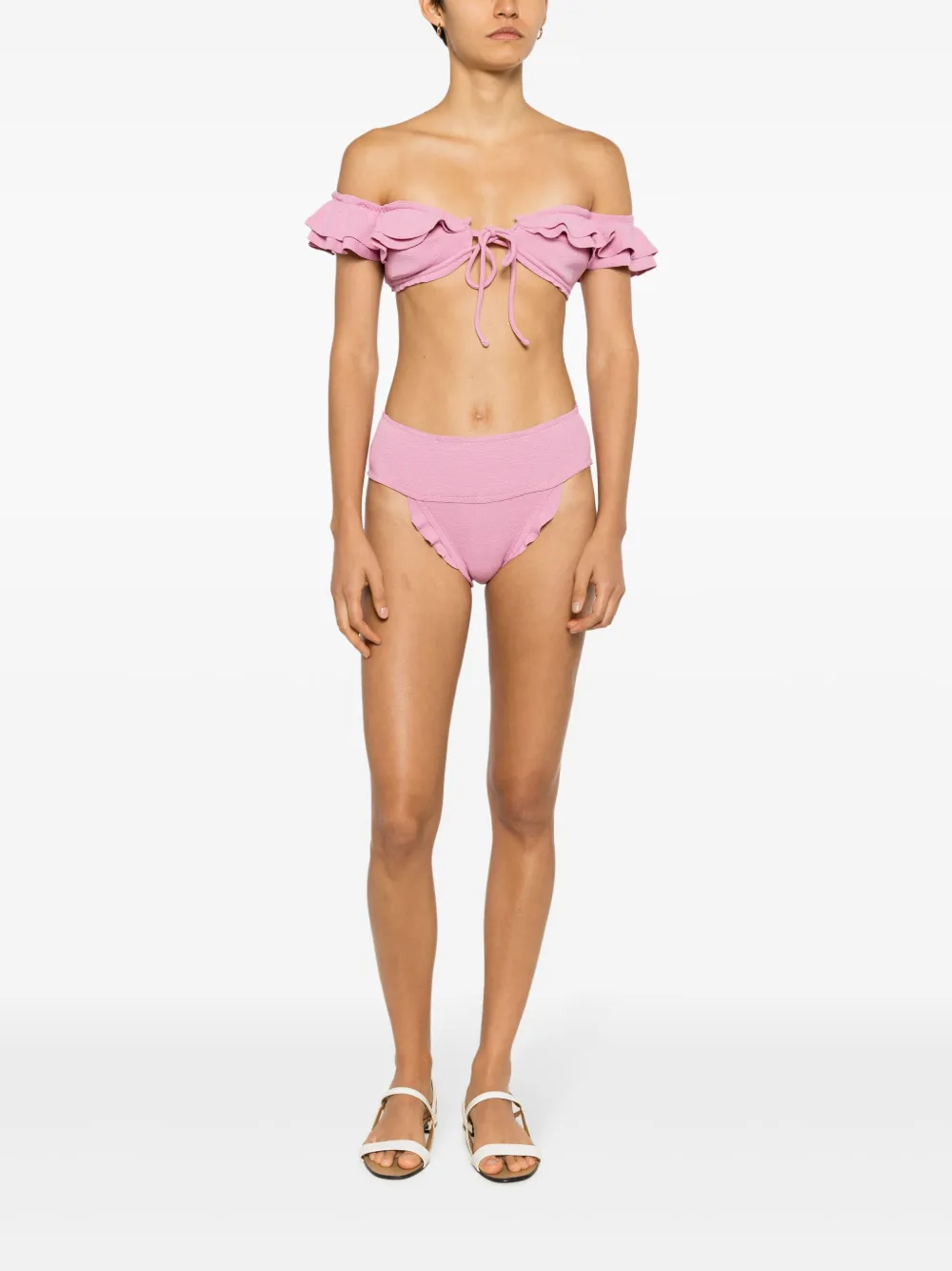 Kauwgomroze, stretch design, ruche details, off-shoulder en striksluiting aan de voorkant. Zwemkleding moet over je eigen kleding worden aangepast..