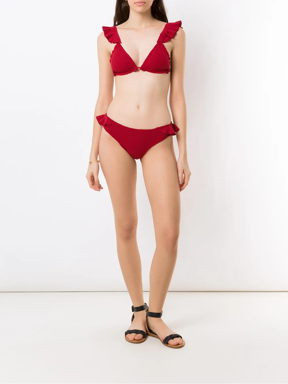 Triangel cup, ruche details, gespsluiting aan de achterkant en getextureerde afwerking. Zwemkleding moet over uw eigen kleding worden aangepast. Doe dit niet als u eenmaal het water in springt.