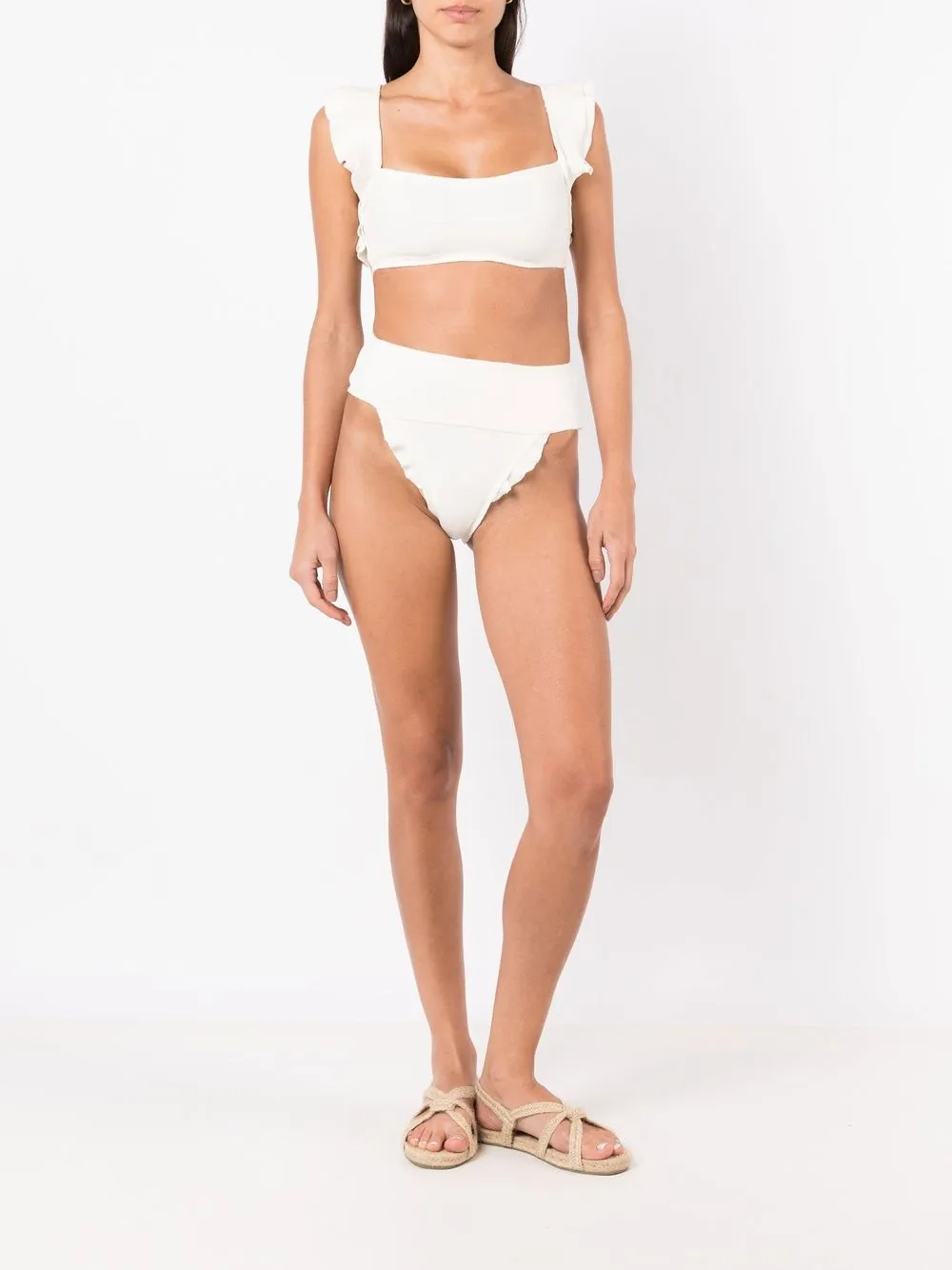 Wit, stretch design, gewelfde afwerking, ruche hals, high waist en medium dekking. Zwemkleding moet over je eigen kleding worden aangepast..
