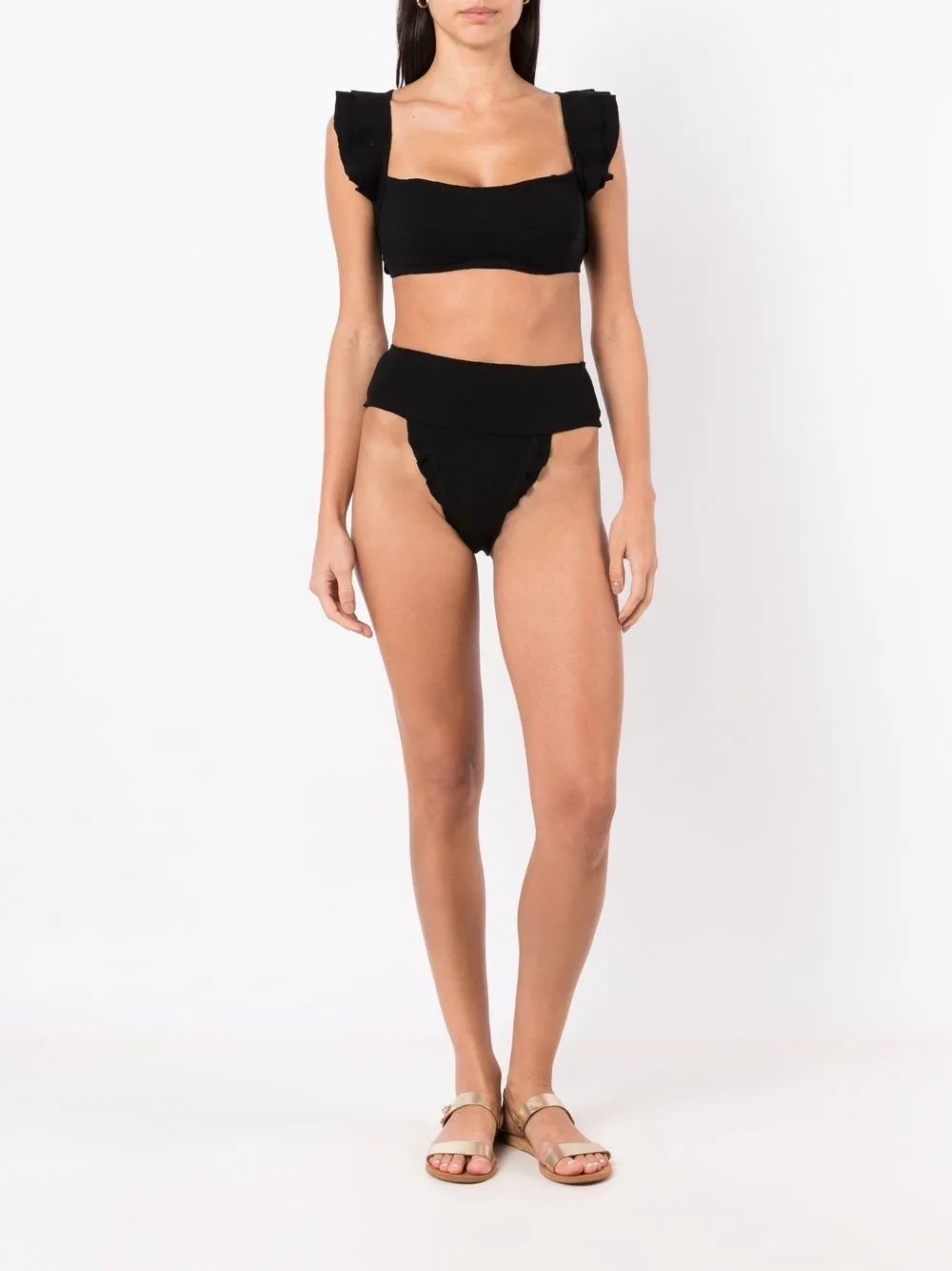 Zwart, stretch design, gewelfde afwerking, ruche hals, high waist en medium dekking. Zwemkleding moet over je eigen kleding worden aangepast..