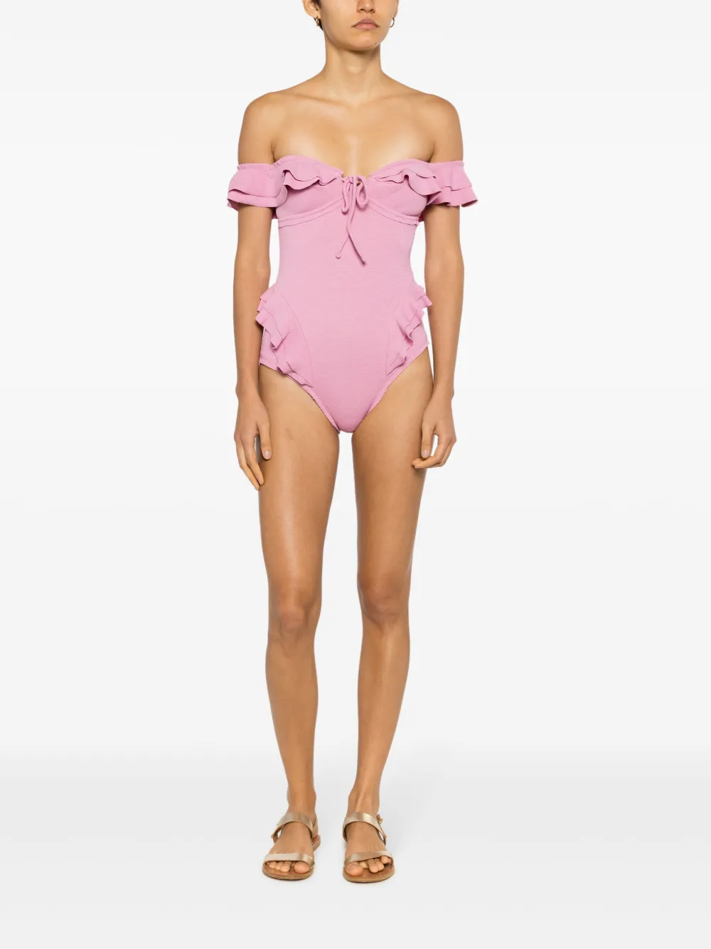Kauwgomroze, stretch design, ruche details, off-shoulder en striksluiting aan de voorkant. Zwemkleding moet over je eigen kleding worden aangepast..
