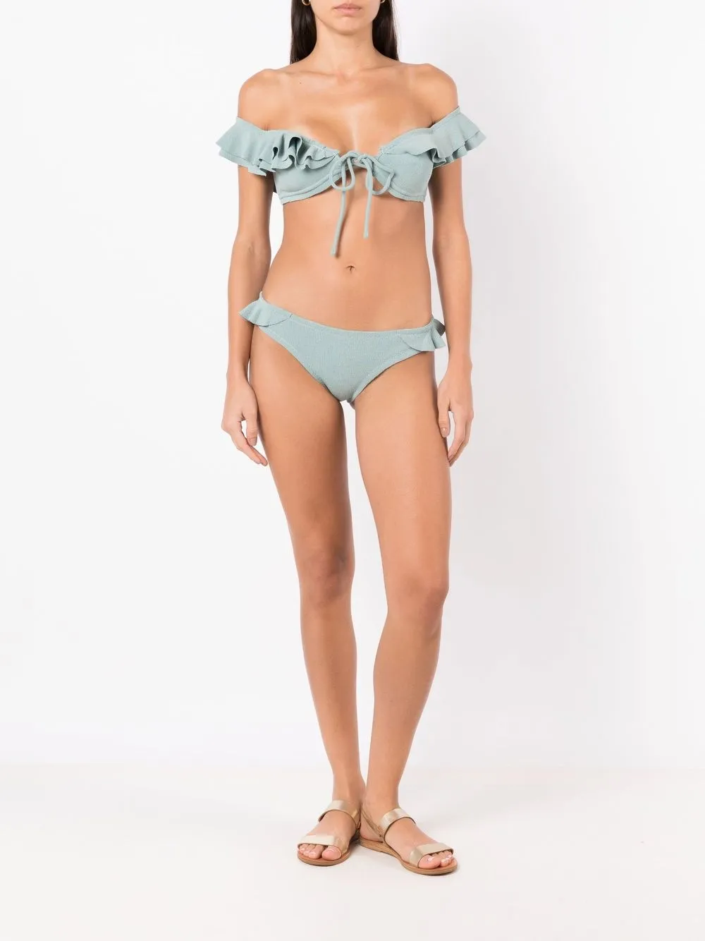 Turkoois, stretch design, off-shoulder, gewelfde afwerking, striksluiting aan de voorkant en ruche hals. Zwemkleding moet over je eigen kleding worden aangepast..