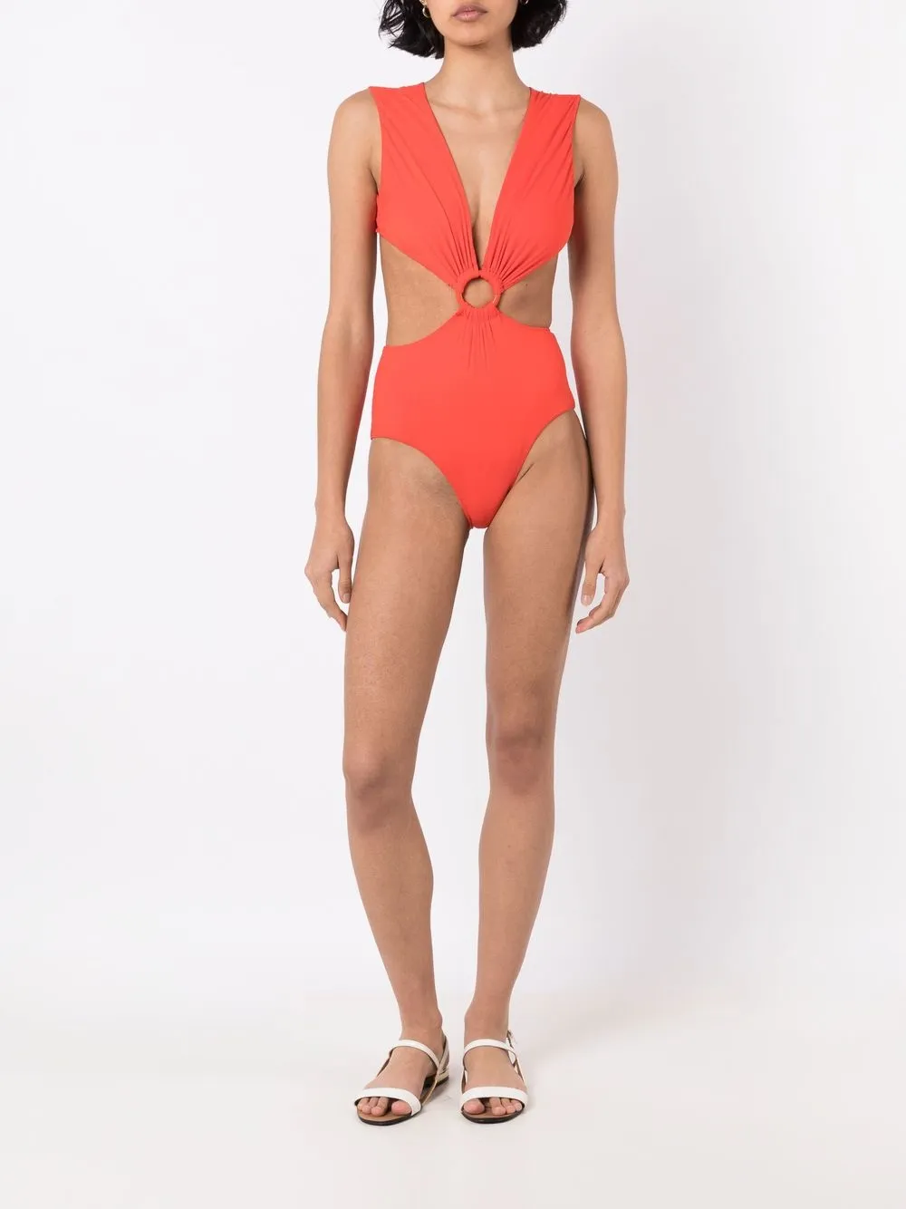 Zonsondergang oranje, uitgesneden detail , ringdetail, V-hals en mouwloos. Zwemkleding moet over je eigen kleding worden aangepast..