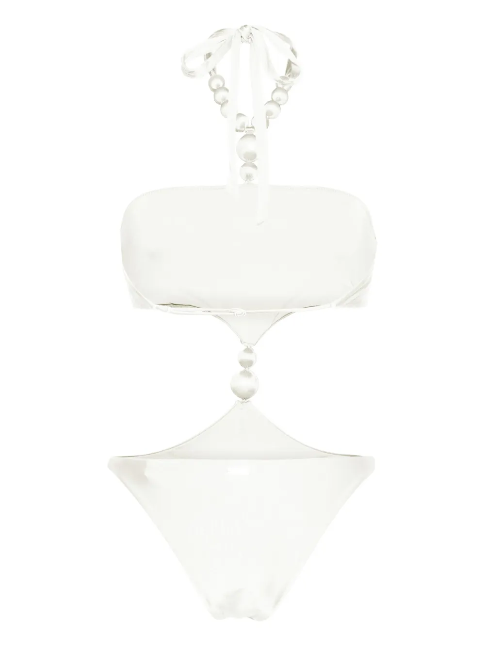 wit stretch design satijnen afwerking uitgesneden detail kralendetail halternek striksluiting verstelbaar bandje aan de achterkant hoog uitgesneden Zwemkleding moet over je eigen kleding worden aangepast.