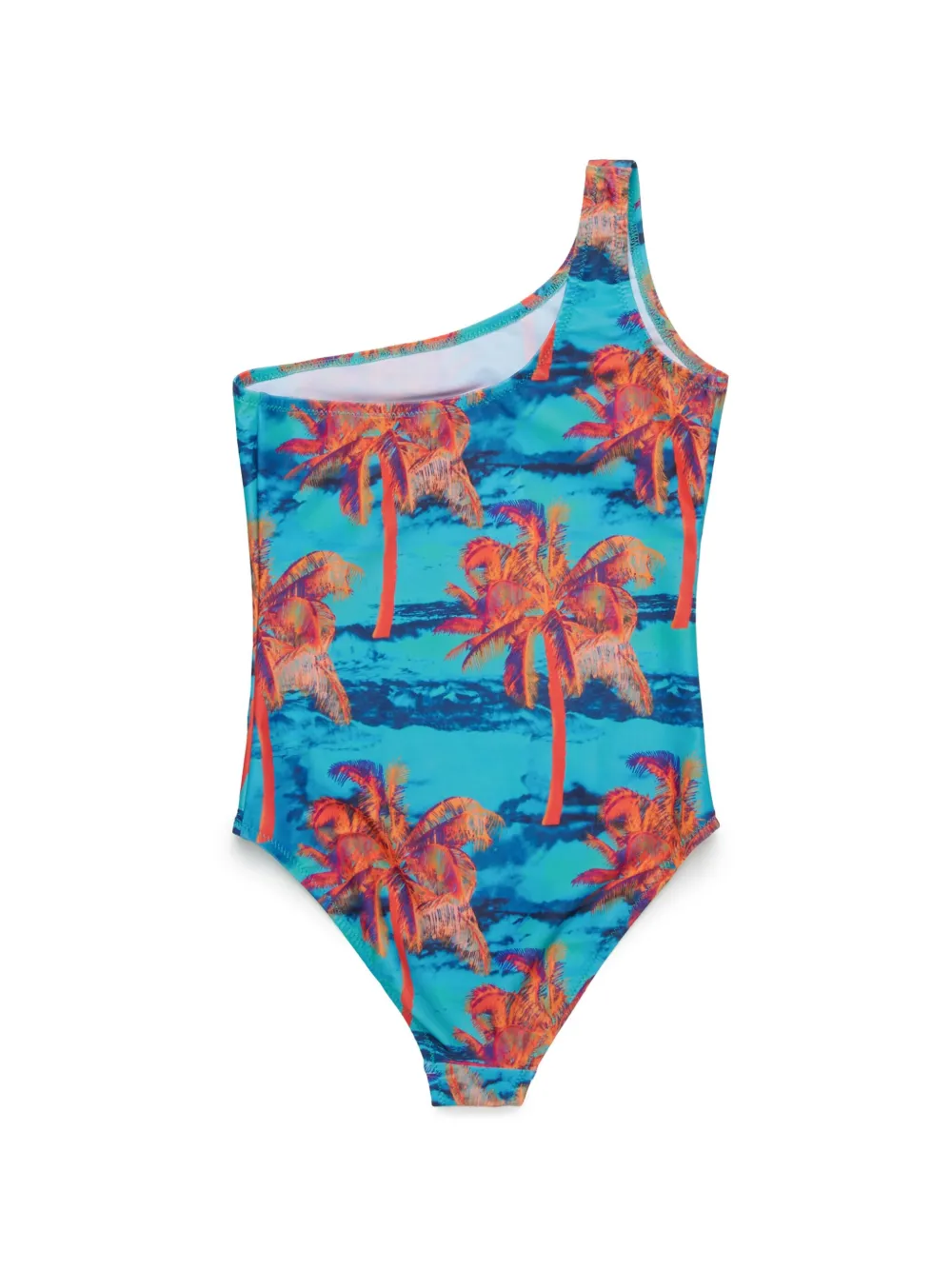 turkoois enkele schouder logoprint op de voorkant Zwemkleding moet over je eigen kleding worden aangepast.
