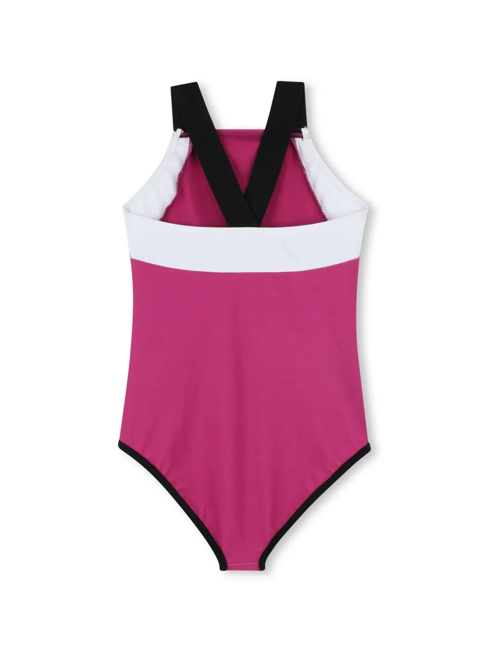 magenta/wit/zwart stretch design design met colourblocking vierkante hals gekruiste schouderbandjes logoprint op de voorkant volledige voering Zwemkleding moet over je eigen kleding worden aangepast.