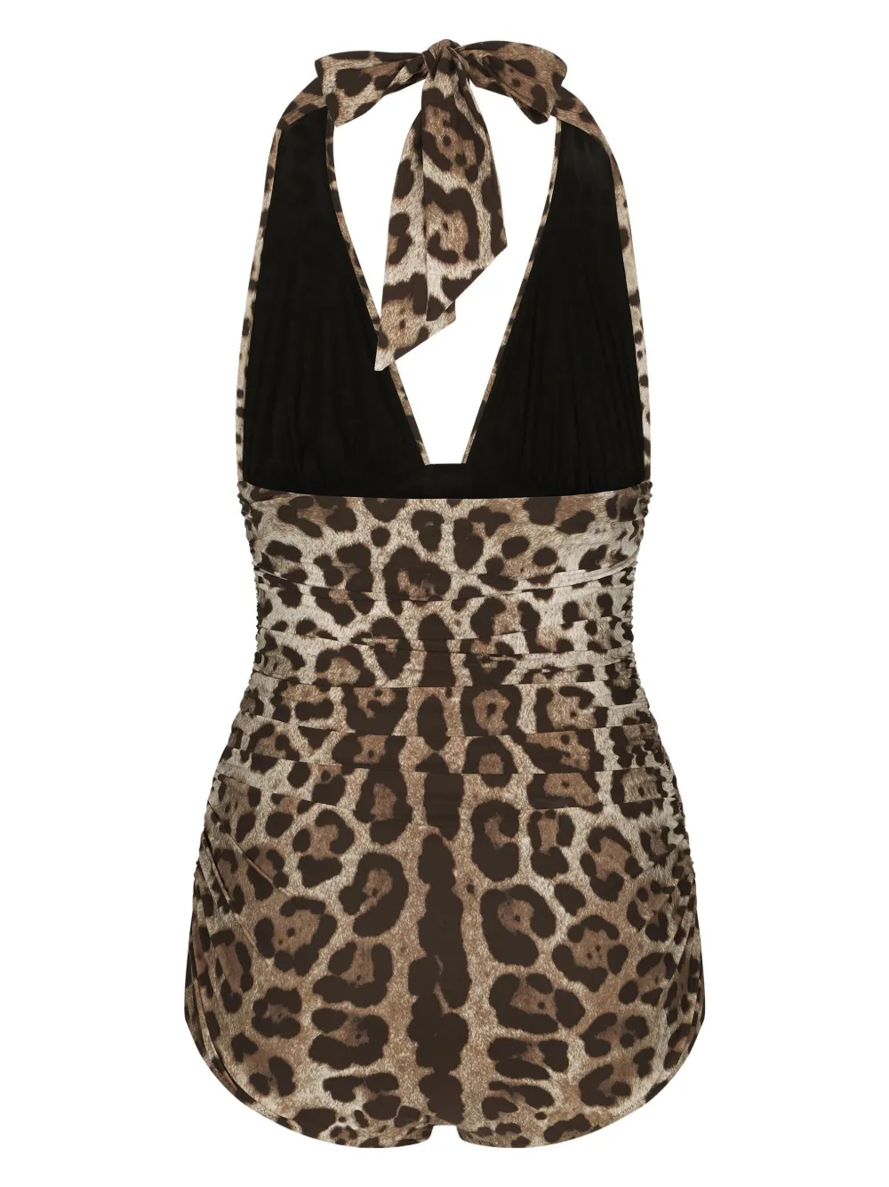 Bruin, licht beige, stretch design, all-over luipaardprint, V-hals en halternek striksluiting. Zwemkleding moet over je eigen kleding worden aangepast..