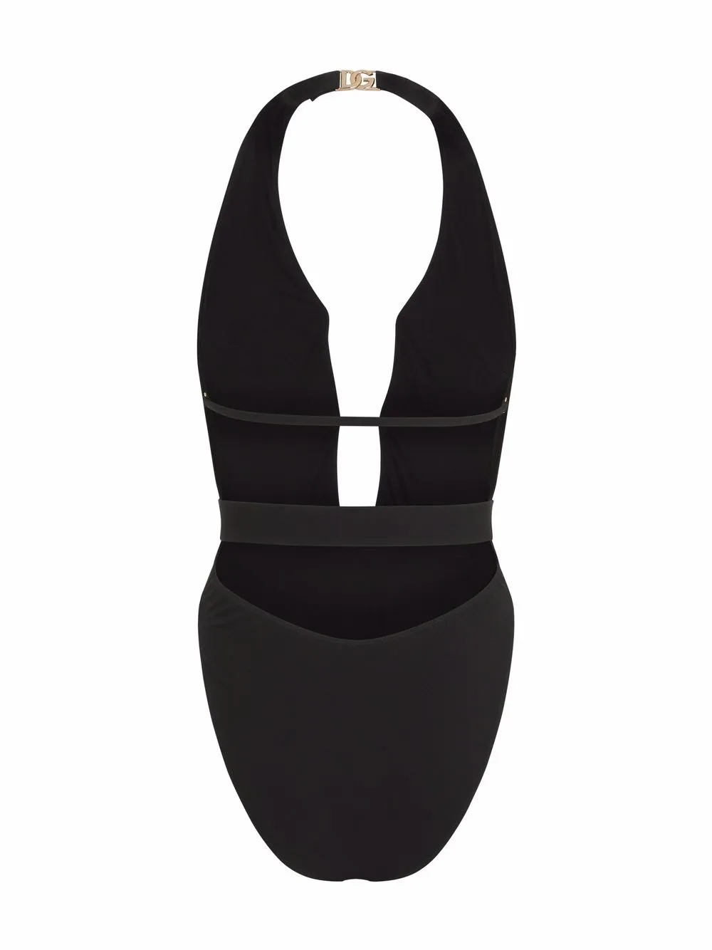 Goudkleurig logo, taille met ceintuur, halternek, plunge stijl en open rug. Zwemkleding moet over je eigen kleding worden aangepast..