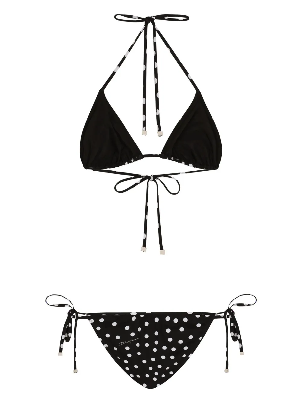 zwart/wit stretch designTop: stippenprint triangel cup halternek striksluiting striksluiting aan de achterkant zilverkleurige hardware met gegraveerd logoBroek stippenprint logo striksluiting aan de zijkant zilverkleurige hardware met gegraveerd logo Zwemkleding moet over je eigen kleding worden aangepast.