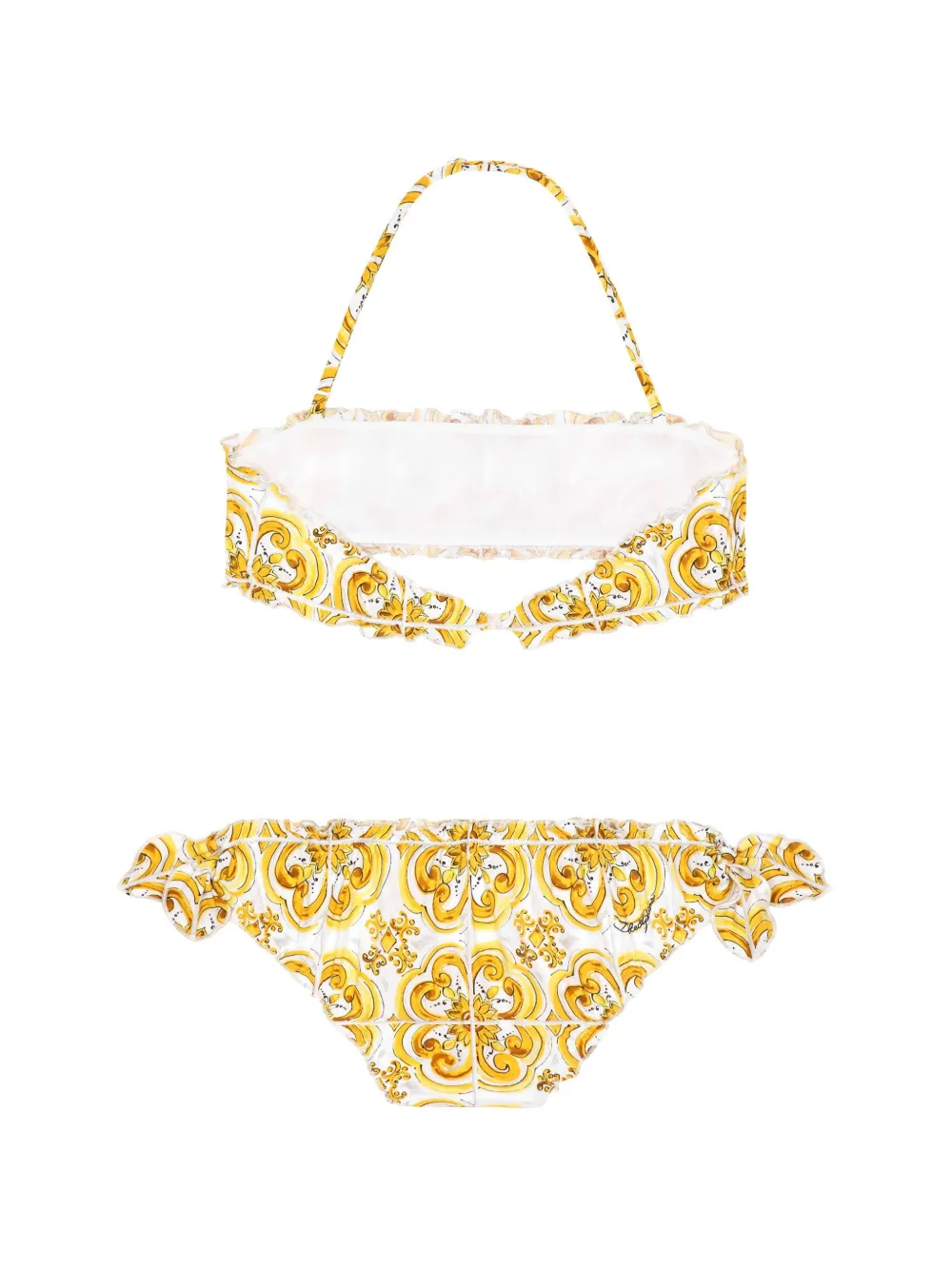 geel/wit Majolica print ruches details halternek bandeau sluiting aan de achterkant Majolica print striksluiting aan de zijkant Zwemkleding moet over je eigen kleding worden aangepast.