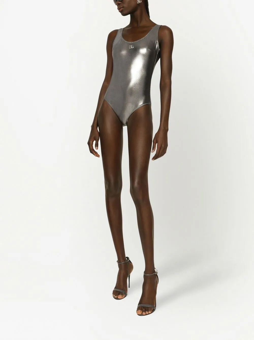 Zilver, logo plakkaat, U-hals, metallic finish, open rug en stretch design. Zwemkleding moet over je eigen kleding worden aangepast..