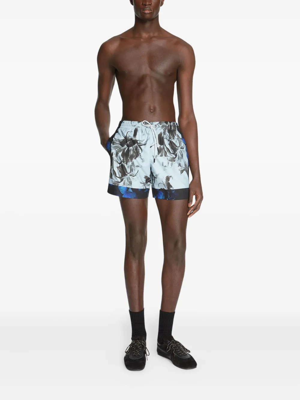 lichtblauw bloemenprint trekkoordsluiting zijzakken donkerblauw vlak nylon Zwemkleding moet over je eigen kleding worden aangepast.