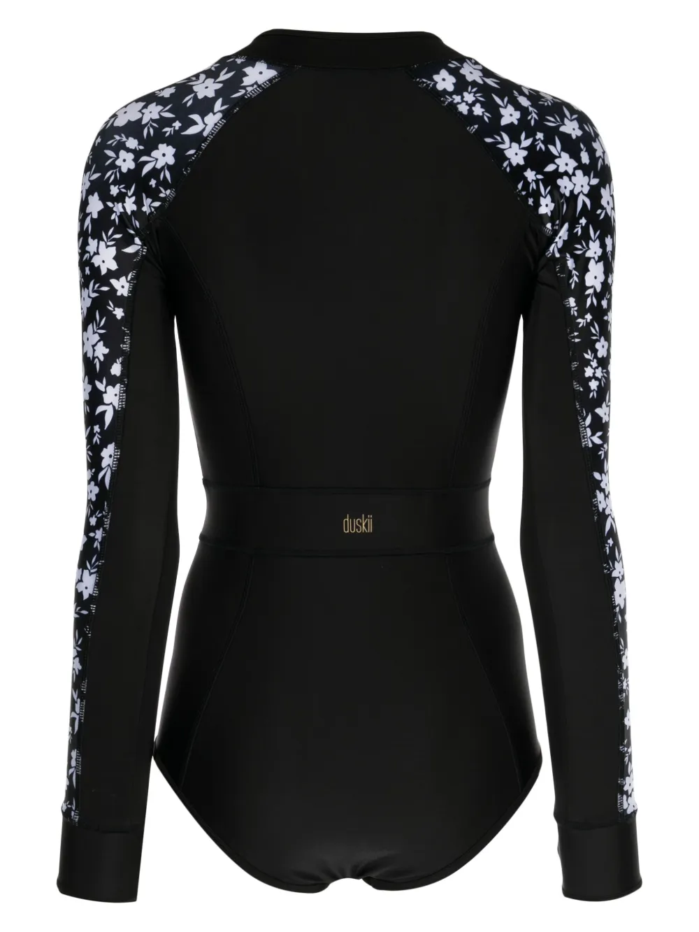 Zwart/wit, stretch design, gerecycled polyester, bloemenprint, logoprint op de achterkant, opstaande kraag, ritssluiting aan de voorzijde en lange mouwen. Zwemkleding moet over je eigen kleding worden aangepast.. .