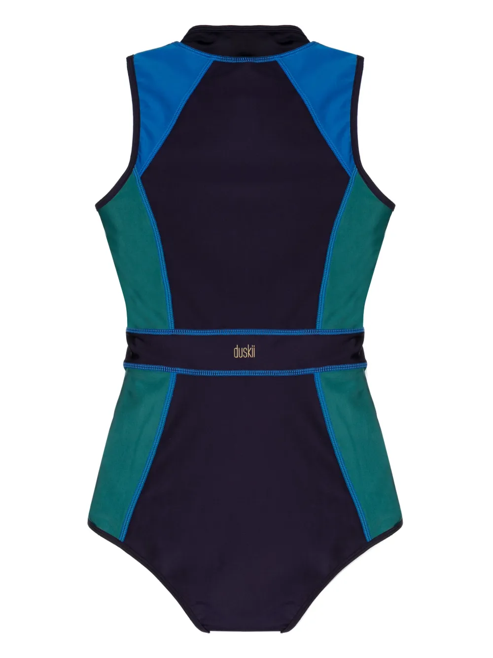 Paars, veelkleurig, stretch design, vlakken met colourblocking, logoprint op de achterkant, opstaande kraag, ritssluiting aan de voorzijde en mouwloos. Zwemkleding moet over je eigen kleding worden aangepast..