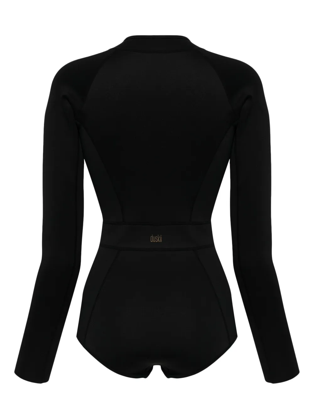 zwart stretch design ronde hals discrete stiksels ritssluiting aan de voorkant lange mouwen dijlengte Zwemkleding moet over je eigen kleding worden aangepast.