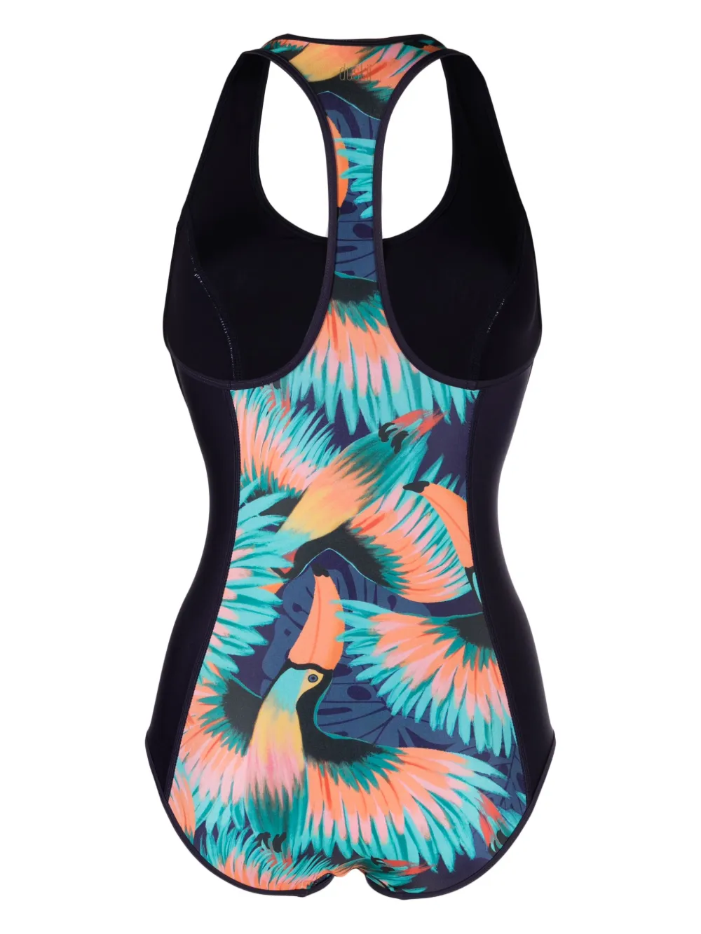 Zwart/veelkleurig, stretch design, gerecycled polyester, dierenprint, logoprint op de achterkant, ritssluiting aan de voorzijde, mouwloos en racerback. Zwemkleding moet over je eigen kleding worden aangepast.. .