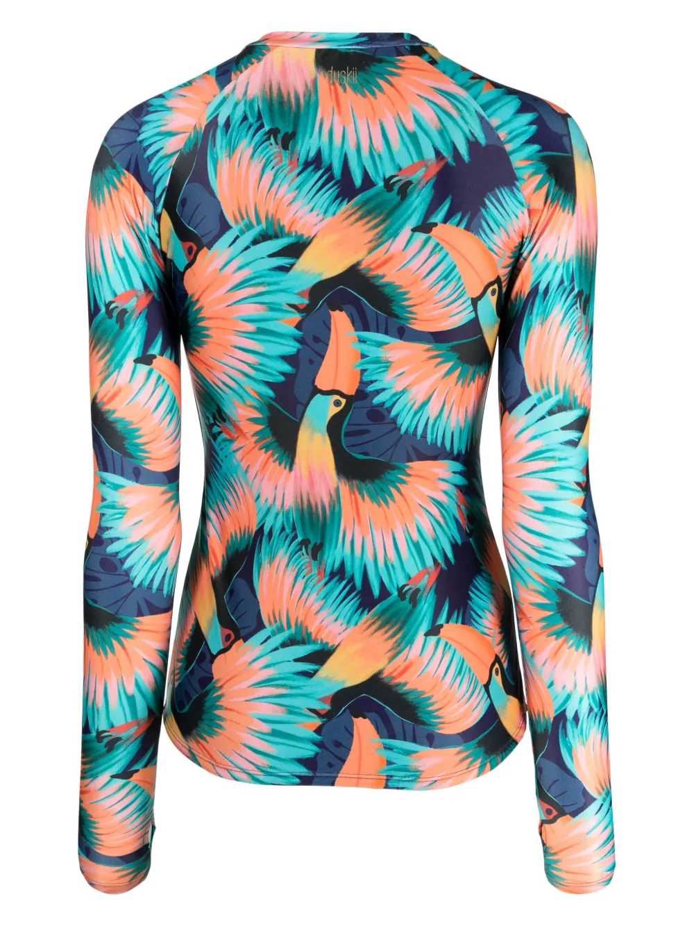 Zwart/veelkleurig, stretch design, gerecyclede polyestermix, dierenprint, logoprint op de achterkant, contrasterende stiksels, ritssluiting aan de voorzijde, lange mouwen, duimgleuven, rechte zoom en ronde hals. Zwemkleding moet over je eigen kleding worden aangepast.. .