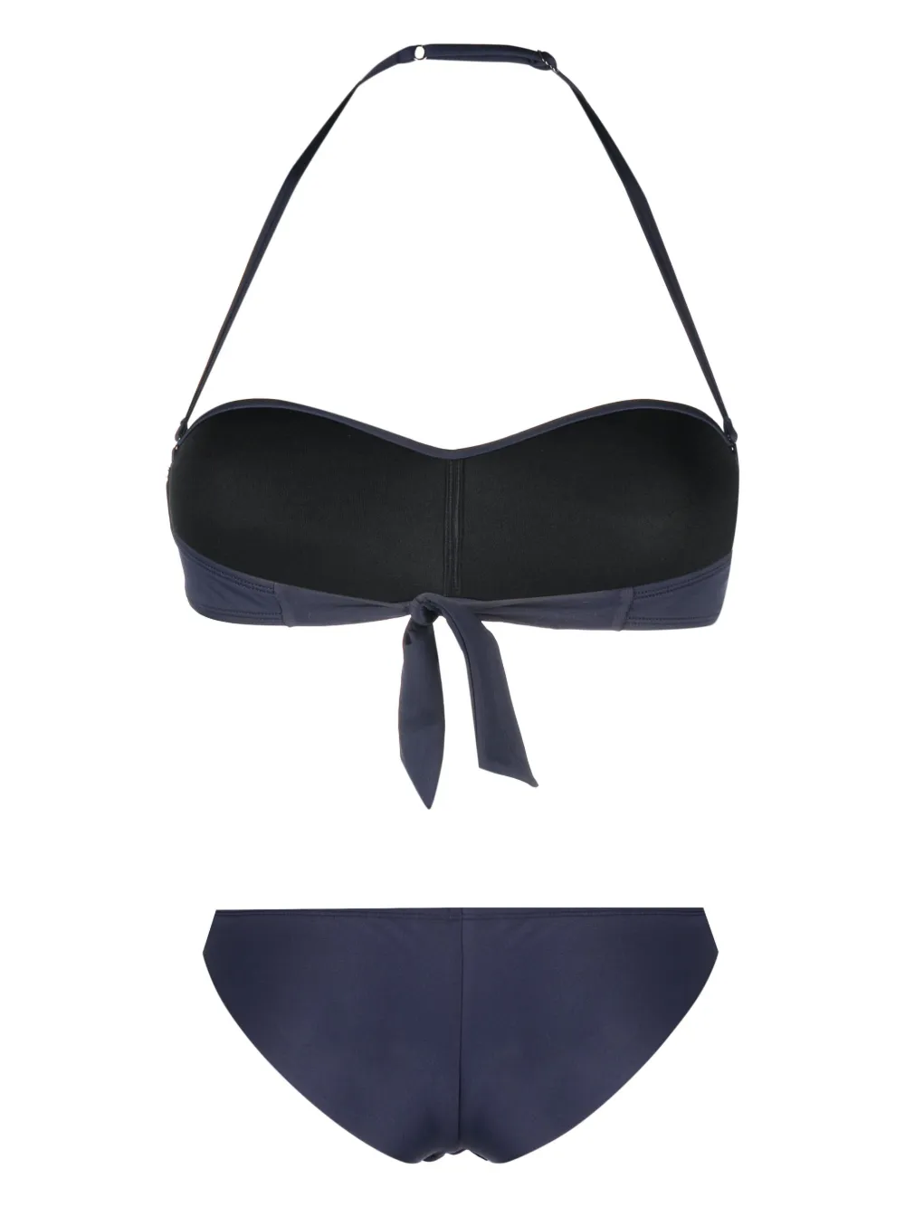 Marineblauw, stretch design, logo versiering, verfraaid met bergkristallen, bandeau, halternek striksluiting, striksluiting aan de achterkant, low waist en slip-on stijl. Zwemkleding moet over je eigen kleding worden aangepast..