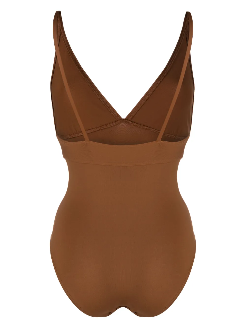 Karamelbruin, stretch design, V-hals, mouwloos en instapmodel. Zwemkleding moet over je eigen kleding worden aangepast..