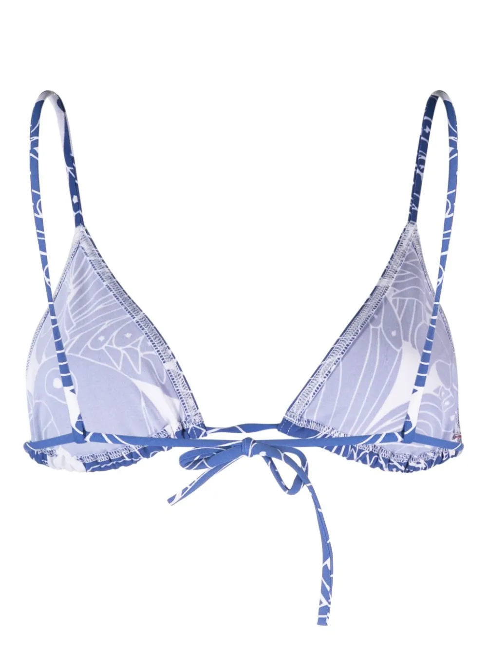Blauw/wit, stretch design, all-over grafische print, triangel cup en striksluiting aan de achterkant. Zwemkleding moet over je eigen kleding worden aangepast..