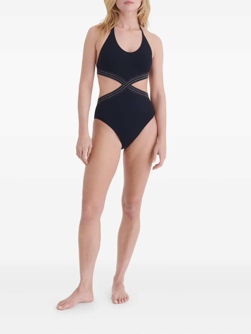 zwart halternek gekruist detail open zijkanten hoog uitgesneden ondersteunende bandjes Zwemkleding moet over je eigen kleding worden aangepast.