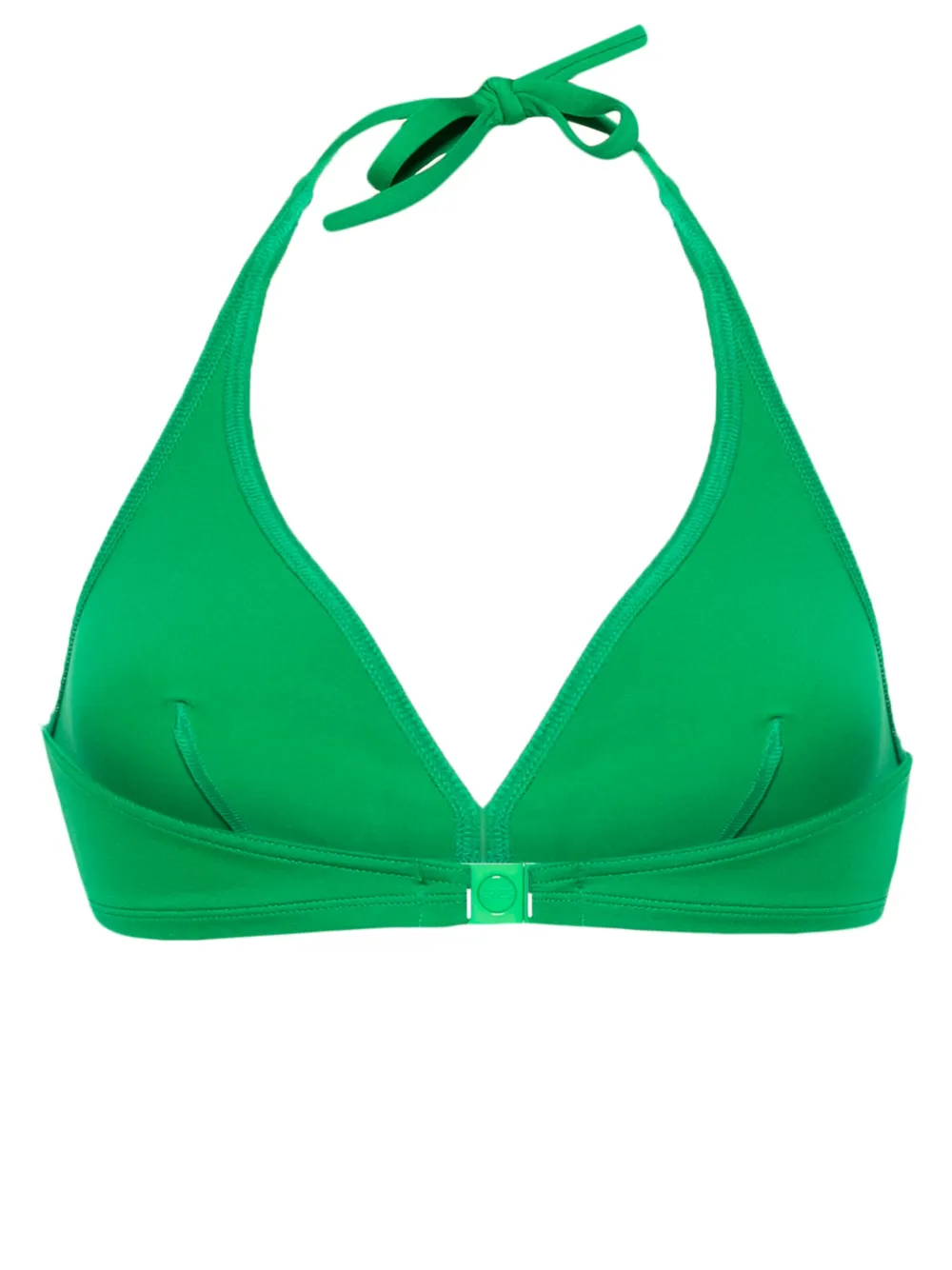 grasgroen stretch design triangel cup halternek striksluiting clipsluiting aan de achterkant zoom afwerking Zwemkleding moet over je eigen kleding worden aangepast.