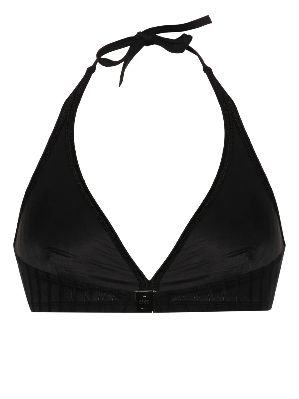 zwart stretch design geribbelde details halternek triangel cup striksluiting aan de achterkant sluiting aan de achterkant Zwemkleding moet over je eigen kleding worden aangepast.