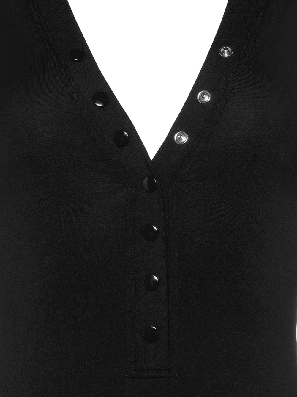 zwart stretch design drukknoopsluiting aan de voorkant brede schouderbandjes V-hals mouwloos getailleerde taille laag uitgesneden rug Zwemkleding moet over je eigen kleding worden aangepast.