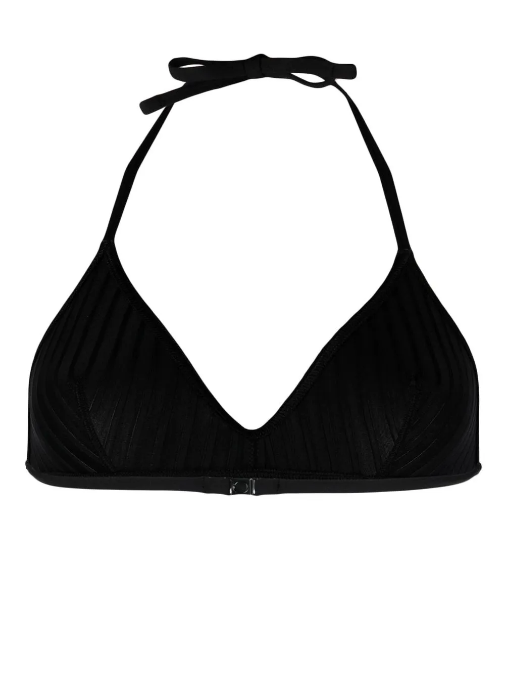 Zwart, geribbelde details, triangel cup, halternek striksluiting en sluiting aan de achterkant. Zwemkleding moet over je eigen kleding worden aangepast..