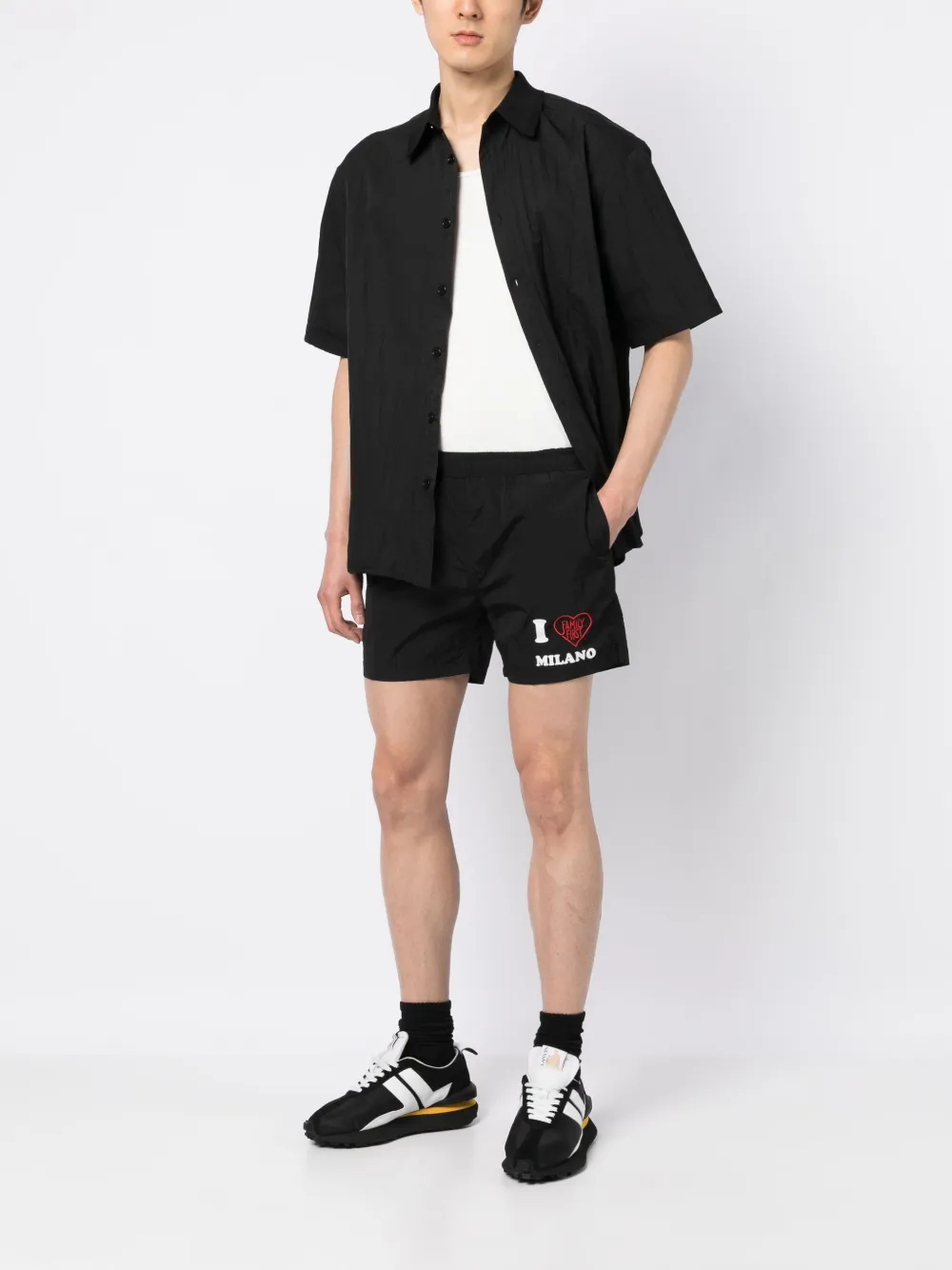 Zwart, logoprint op de voorkant, elastische tailleband, dijlengte en twee ingenaaide zijzakken. Zwemkleding moet over je eigen kleding worden aangepast..